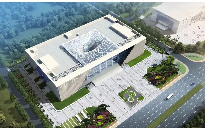 2.技術(shù)難點(diǎn):本項(xiàng)目功能綜合,根據(jù)不同功能區(qū)人員密集程度不同,設(shè)計(jì)不同的快捷疏散通道,同時(shí)能體現(xiàn)出八大展廳功能布置的合理及規(guī)范。外立面系部圓弧采用條型金屬板實(shí)現(xiàn),使轉(zhuǎn)角過(guò)度更加平滑;入口處采用鋼結(jié)構(gòu)空間桁架滿足建筑大懸挑和造型的要求;躍層的大廳采用鋼結(jié)構(gòu)玻璃頂,使之更加開(kāi)敞明亮。